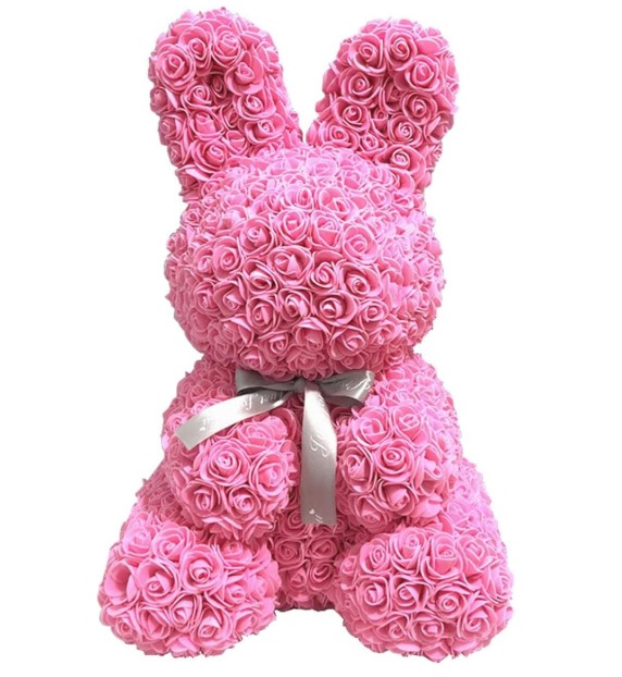Adorable conejo hecho de rosas rosadas eternas con lazo de cinta.